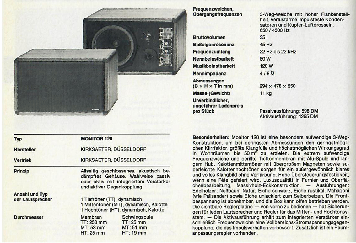 Closed speakers of monitor type, manufactured in Germany around 1979. Typical example of speakers from so called "Audio Golden Era". Relatively small, with big bass speaker, three way construction equipped with attenuators for mid and high frequencies allowing to decrease amount of mids and higs. Not so often used - fuses for each driver separately. Very rare box finish - made off a full wooden walnut planks. Below you can see original page from company leaflet.