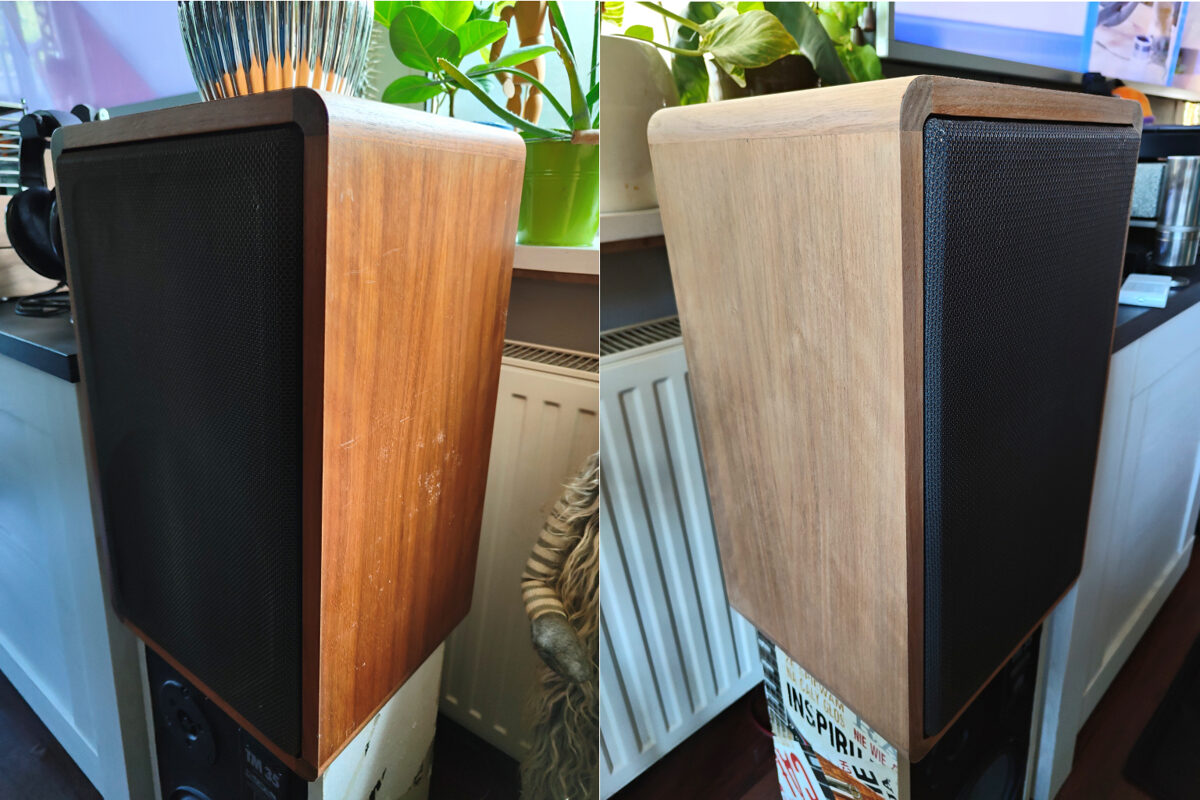 As every single example of vintage audio they needed some treatment to start work and look good. Recent owner covered boxes with lacquer, which got old and changed colour to orange. Removing it was hard, but effect worth work. On the left original one, right - after lacquer remove. Nice!